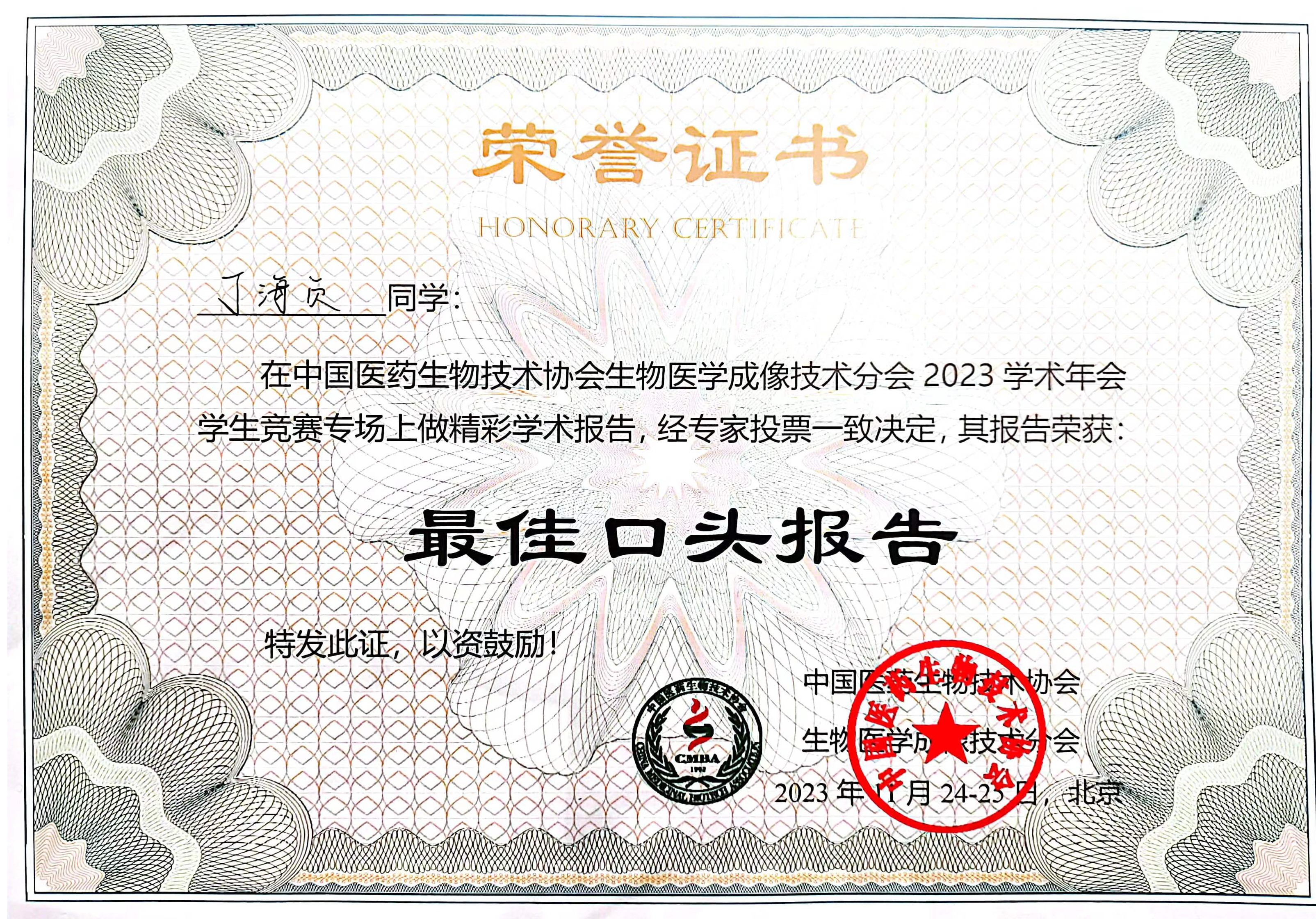 恭喜丁海贞同学参加中国医药生物技术协会生物医学成像技术分会2023学术年会并获得最佳口头报告奖!Congs!!